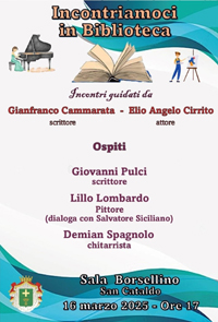 Incontriamoci in Biblioteca č un ciclo di eventi culturali con cadenza mensile che promuove l'incontro tra la comunitā e la cultura di San Cataldo (CL). Gli incontri si svolgono nella Sala Borsellino della Biblioteca Comunale della cittā e sono presentati dallo scrittore Gianfranco Cammarata e dall'attore Elio Cirrito. |